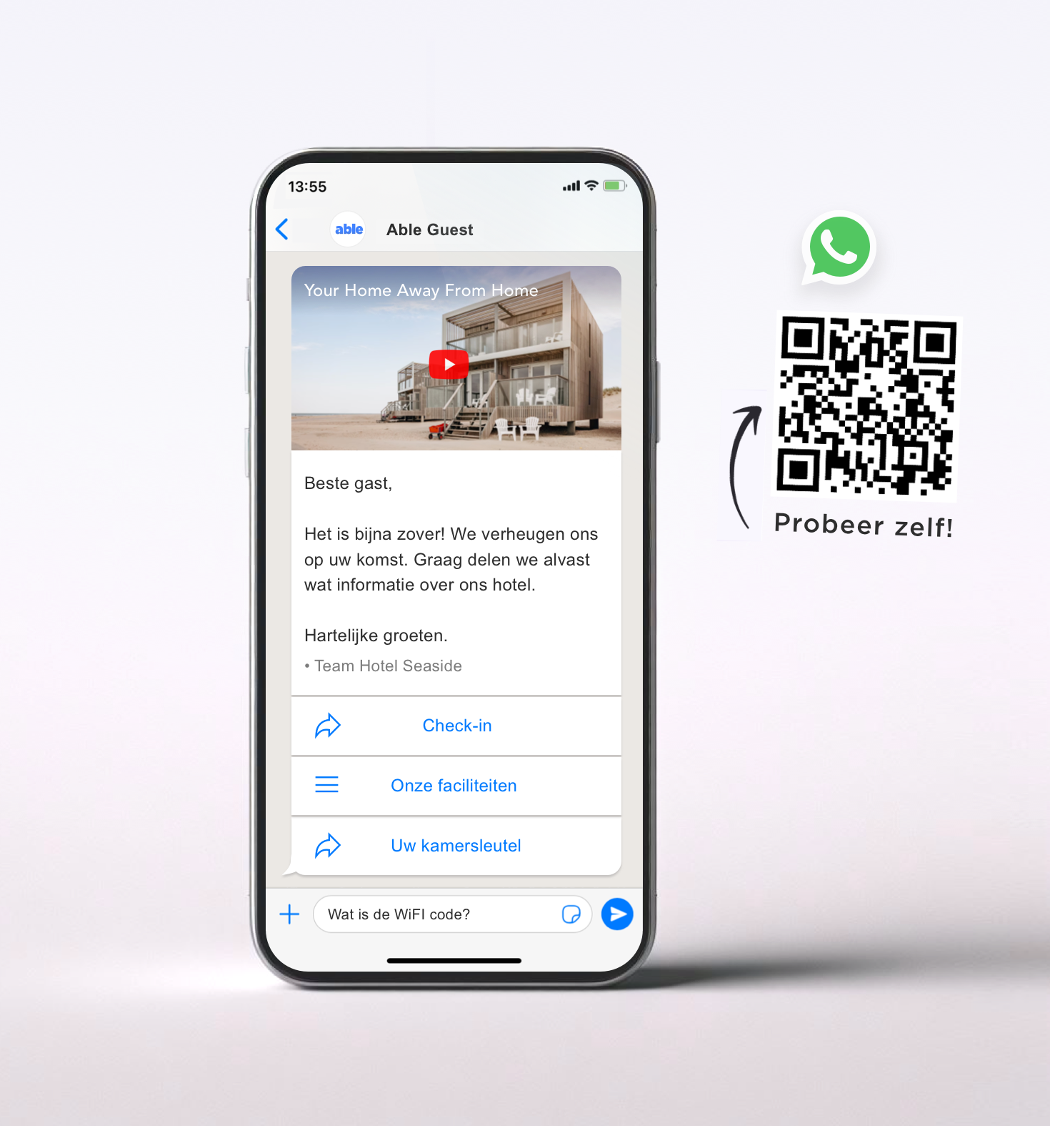 Onder de noemer able guest bundelen we specifieke oplossingen voor hotels, Airbnbs, en vakantieparken. Denk aan sleutelloze toegang, vereenvoudigde informatievoorziening, en het op afstand kunnen beheren van uw faciliteiten en diensten. Vergroot de betrokkenheid en loyaliteit van uw gasten, en verhoog de efficiëntie van uw organisatie.